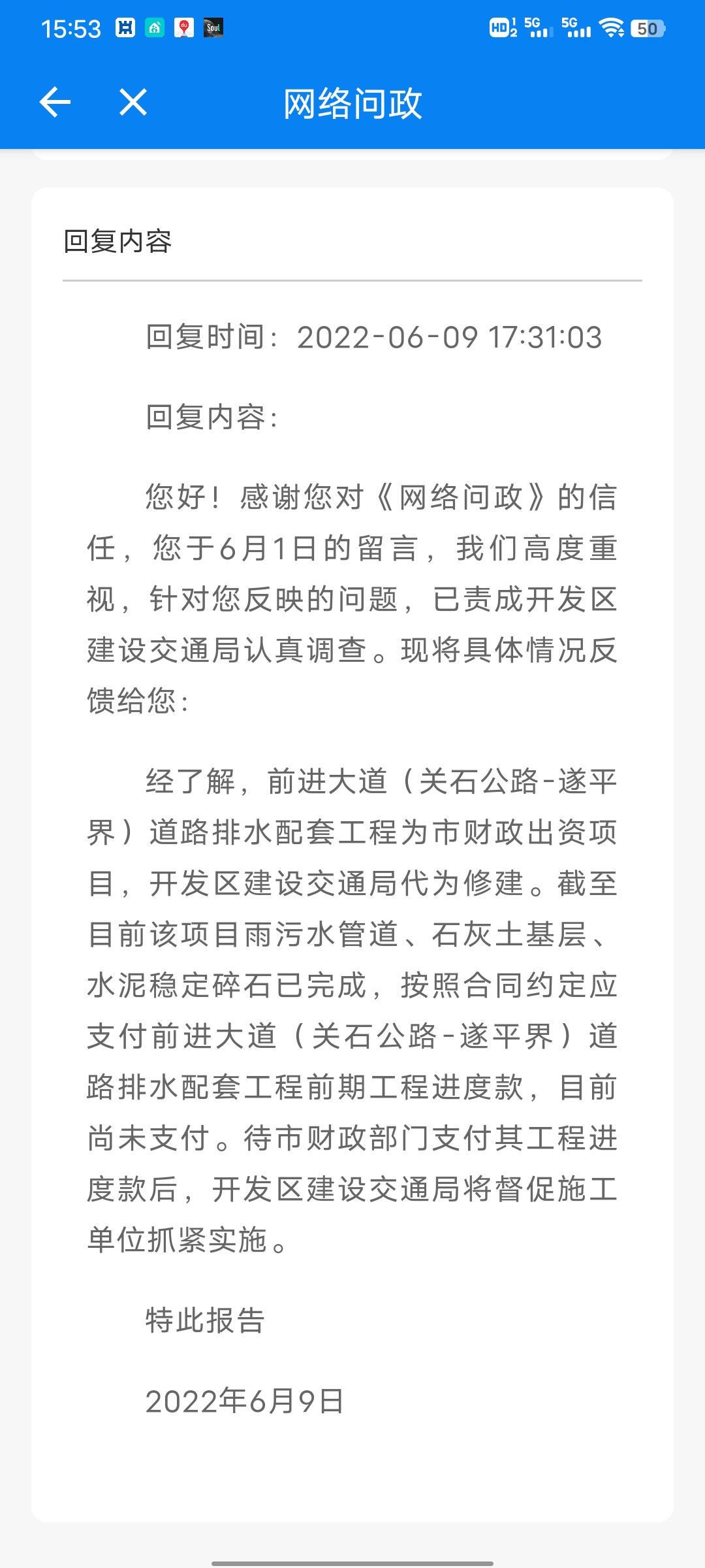 | 留言内容 | 前进大道北段何时才能修通方便沿线大家?去年就咨询说财政资金没下来马上就一年了还是一点动静都没有。希望尽快修好通车方便沿线大家出行。